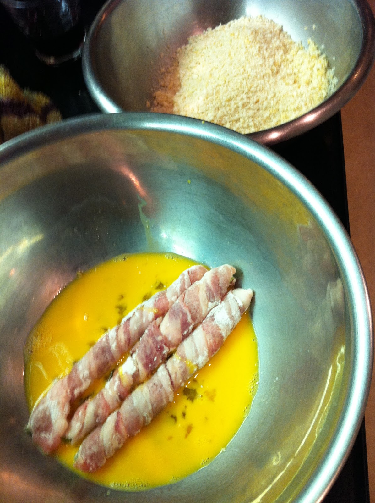 卵を溶いて牛乳をチョビット入れたつなぎにくぐらせて、パン粉をまぶします。